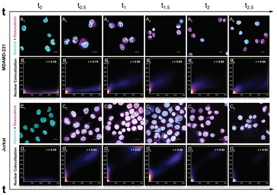 In both MDA-MB-231 and Jurkat cells, doxorubicin was internalized and immediately started to localize in the cells’ nuclei after 30 min of incubation (Figure 5), with a high degree of nuclear colocalization in both cell lines.