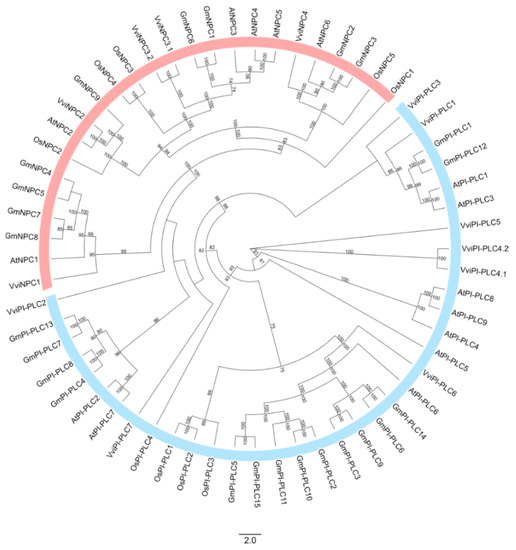 Maximum likelihood phylogenetic tree based on 61 Phospholipases C proteins from Arabidopsis thaliana (At), Oriza sativa (Os), Glycine max (Gm) and Vitis vinifera (Vvi). Different groups are represented by different colours: NPC in red and PI-PLC in blue. The numbers above the branches show bootstrap values. The scale bar represents the number of estimated changes per branch length.