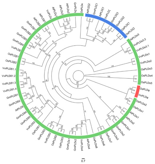 - Liu, Q.; Zhang, C.; Yang, Y.; Hu, X. Genome-Wide and Molecular Evolution Analyses of the Phospholipase D Gene Family in Poplar and Grape. BMC Plant Biol. 2010, 10, 117. [Google Scholar] [CrossRef] [PubMed]