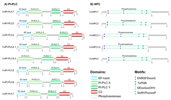 Peptide domain structures and conserved motifs of grapevine PLC members. Schematic diagram representing: (A) PI-PLC and (B) NPC groups. Different motifs and domains are indicated by different colours.