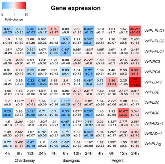 Heatmap representing the expression of VviPI-PLC1; VviPI-PLC2; VviPI-PLC7; VviNPC3; VviNPC4; VviPLDα3; VviPLDβ; VviPLDζ; VviFAD8; VviFAD2-1; VviSAD-1 and VvisPLA2 genes on each of the grapevine cultivars Chardonnay, Regent and Sauvignac. Fold change refers to the comparison between inoculated and mock-inoculated samples at 4, 6, 12 and 24 hpi. Blue indicates lower expression; red indicates higher expression and white indicates no expression (see colour scale). The statistical analysis was performed by Tukey’s multiple comparison tests. Lettering refers to comparisons between the expression of a specific gene between the genotypes at each time point.