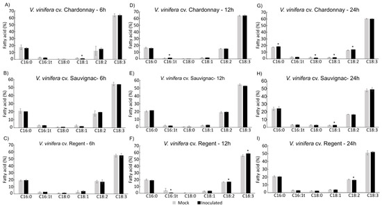 Fatty acid composition of mock-inoculated and inoculated leaves of V. vinifera cultivars. Chardonnay, Sauvignac and Regent with P. viticola (NW-10/16 isolate), at 6, 12 and 24 hpi. Values correspond to average ± standard deviation, * significantly different p < 0.05, n = 5.