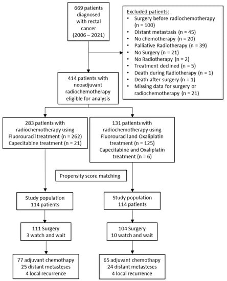 Between January 2006 and November 2021, a total of 669 patients with rectal cancer were treated at the Department of Radiation Oncology of the Coburg Cancer Centre and analyzed in this retrospective study. The CONSORT-diagram is shown in Figure 1. Exclusion criteria were (1) primary surgery, (2) evidence of distant metastases, (3) palliative radiotherapy, (4) no concurrent chemotherapy, (5) treatment refusal, (6) death during radiotherapy or surgery, and (7) insufficient data for surgery or RCT. A total of 414 patients with nRCT were identified and included in the study; 262 patients were treated by nRCT using concurrent chemotherapy with fluorouracil, 21 patients were treated using capecitabine, 125 patients were treated using a combination of fluorouracil and oxaliplatin, and 6 patients were treated with a combination of capecitabine and oxaliplatin. To reduce potential confounding effects between the fluorouracil/oxaliplatin treated group and the sole treatment with fluorouracil or capecitabine, propensity score matching analyses (PSM) were performed. In the matched cohort, 114 patients were included in each study population.
