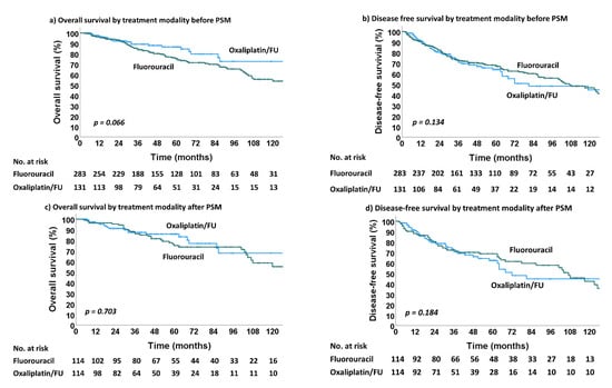 The median follow-up time after PSM was 59.5 weeks in the fluorouracil-group and 43 weeks in the fluorouracil/oxaliplatin group (p = 0.003). The median disease-free survival time was also statistically significant, being 47 weeks in the fluorouracil group and 32 weeks in the fluorouracil/oxaliplatin group (p = 0.035). As shown in Figure 2, there was no statistically significant difference between these two groups for both OS and DFS neither before nor after propensity score matching (72.6% vs. 55.4%, p = 0.066 and 67.8% vs. 55.1%, p = 0.703, respectively, for OS, and 44.8% vs. 46.8%, p = 0.134, and 44.7% vs. 42.3%, p = 0.184, respectively, for DFS). After PSM, local recurrence was reported in 4 cases in each treatment group (p = 1), and distant metastatic events were reported in 25 (22%) and 24 (21%) patients of the fluorouracil group and the fluorouracil/oxaliplatin group, respectively (p = 0.872).