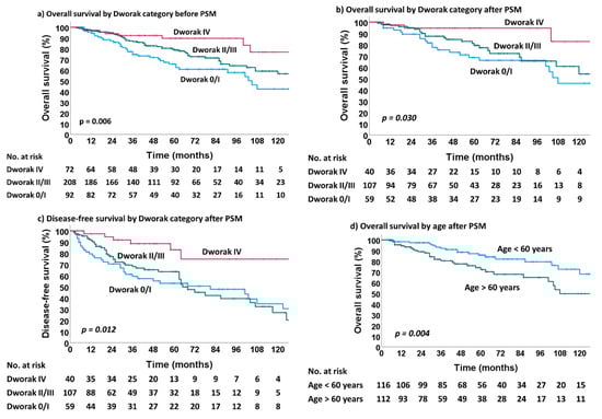 Overall survival and disease-free survival of the study population: (a) overall survival by Dworak category before PSM; (b) overall survival by Dworak category after PSM; (c) disease-free survival by Dworak category after PSM; (d) overall survival by age after PSM.