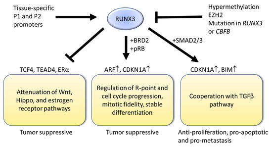 Mouse knockout models have been instrumental in understanding the role of RUNX3 during carcinogenesis. While it should be noted that Runx3 deficiency in different mouse strains (e.g., BALB/c and C57BL/6) demonstrated phenotypic variability with respect to the inflammatory response, all revealed susceptibility to preneoplastic changes. RUNX3 modulates the signaling intensities of developmental pathways, such as the transforming growth factor β (TGFβ), wingless-type MMTV integration site (Wnt) and RAS signaling pathways [8]. The TGFβ pathway regulates proliferation, differentiation and apoptosis and, as such, plays crucial roles in tissue homeostasis and regeneration [43]. TGF-β signaling contributes to the maintenance and differentiation of various tissue stem cell types through intrinsic signaling, as well as non-autonomous cues from niche cells [44]. TGFβ signaling is context-dependent during tumorigenesis, functioning as a tumor suppressor in preneoplasia and metastasis promoter in late-stage cancer [43]. Early studies revealed the interaction and functional cooperation of RUNX3 with TGFβ effectors SMAD2/3 [45,46] (Figure 1). RUNX3 binds to the RUNX consensus motifs in the promoters of cell cycle inhibitor CDKN1A and pro-apoptotic BIM to directly regulate their transcription in a TGFβ-dependent manner [47,48]. The gastric mucosa of the Runx3 null C57BL/6 mouse model has been shown to exhibit hyperplasia, which was attributed to increased proliferation and suppressed apoptosis as a result of impaired TGFβ signaling [6]. Gastric epithelial cell lines derived from the fetal stomach of Runx3−/− p53−/− mouse are prone to spontaneous epithelial–mesenchymal transition (EMT) and this results in a tumorigenic stem-cell-like subpopulation [49,50]. It has also been suggested that RUNX3 safeguards gastric epithelial cells from aberrant Wnt- and TGFβ-mediated cellular plasticity and stemness [49].