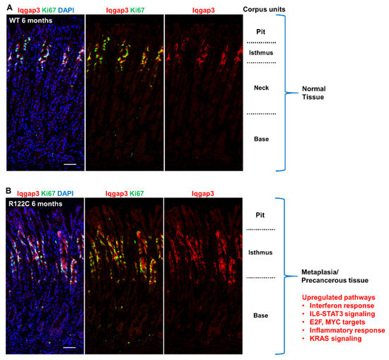 RUNX3R122C/R122C mice exhibit increased isthmus stem cell proliferation. Immunofluorescence staining of corpus units in wild-type and RUNX3R122C/R122C mice. Proliferating isthmus stem cells are marked by stem cell marker IQGAP3 (red) and proliferation marker Ki67 (green). DNA is stained by DAPI. (A) Wild-type mice at 6 months of age. (B) RUNX3R122C/R122C mice at 6 months of age show precancerous tissue with the indicated upregulated pathways [41].