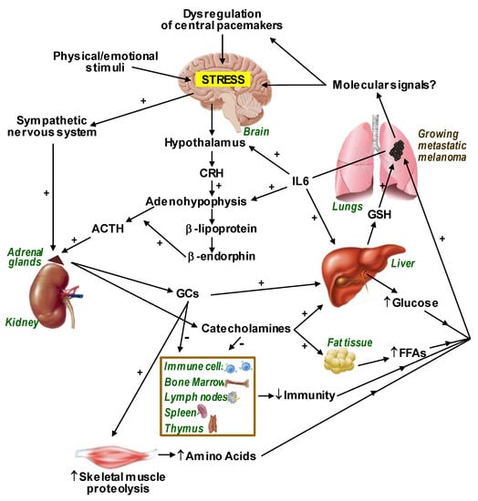 Figure 1 schematically describes the pathophysiology of stress and its metabolic consequences in metastatic melanoma-bearing mammals.