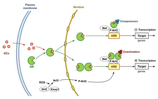 Glucocorticoids and the Antioxidant Defense of Melanoma Cells. The GR is encoded by the NRC31 gene which can produce a number of receptor isoforms, the GRα being the primary receptor involved in glucocorticoid (GC) signaling. The cytosolic GR complexes with different proteins, i.e., Hsp90, Hsp70 and the FK506-binding protein 4. GCs diffuse through the plasma membrane into the cytoplasm and binds to the GR resulting in the release of heat shock proteins. Based on the two-part model proposed by Gerber et al. [142], the cytoplasmic GR interacts with glucocorticoids, thus causing a conformational change and nuclear translocation. GR interacts with both the DNA and other transcriptional machinery to orchestrate its genomic effects through three main mechanisms: direct binding to glucocorticoid response elements, transcription factor tethering, and binding of composite elements within the DNA [143]. Hypothetically, at high pharmacological levels of GCs, primary repression could result from an excessive amount of GR monomers tethering to the ARE-Nrf2 complex (Nrf2 dimerizes with a basic region-leucine zipper bZIP protein and binds to the ARE to activate gene transcription), then leading to recruitment of corepressors. In this mechanism, GR associates with NF-κB or AP-1 [144,145], thus resulting in repression of their activity in a process attributed to recruitment of transcriptional corepressors such as the nuclear receptor co-repressor 1 and the histone deacetylase 2 [146]. At lower extracellular levels of GCs (pathophysiological levels), GR homodimers (predominantly formed) would recruit coactivators (such as the steroid receptor coactivator-1, SRC-1; or the GR-interacting protein-1, GRIP-1) [147] and induce the transcription of genes encoding antioxidant/defense enzyme activities. This double model may help to reconcile the controversy in the results obtained by different groups.