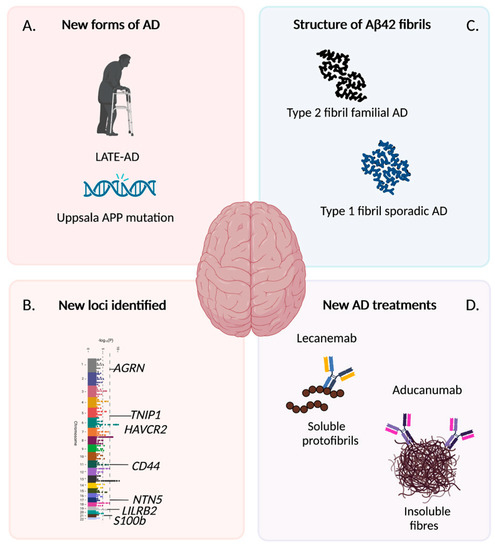 Highlighted major breakthroughs in the Alzheimer’s disease (AD) field over the last decade. New forms of AD have been identified including a sporadic form called LATE [2] and a familial form referred to as the Uppsala APP mutation [3] (A). New gene loci associated with development of AD have been identified, with a few of the recent loci from [4] and [5] shown here (B). Researchers have identified the structural insights of amyloid beta (Aβ) showing fibrils differ between familial and sporadic AD [6] (C). Progress has recently been made in finding treatments for AD including Lecanemab and Aducanumab, which have recently been approved and marketed in the US. Both target the removal of Aβ but have different preferences in their ability to remove either soluble protofibrils or insoluble fibers (D). Created with BioRender.com.
