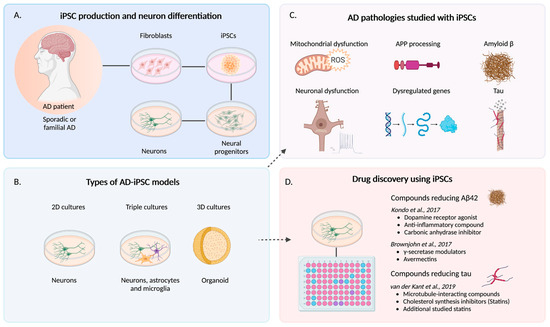 Modeling of Alzheimer’s disease using iPSCs. Human iPSCs are produced from fibroblasts and differentiated into neurons (A) that can be cultured in simple 2D conditions, triple cultures, or in 3D as organoids (B). Human AD-iPSCs have been used to study several different pathologies including amyloid precursor protein (APP) processing and increased amyloid beta 42 (Aβ42), tau phosphorylation and neuronal dysfunction (C). AD-iPSCs have also been used to screen and find candidate compounds that can reduce Aβ42 and tau (D). Created by BioRender.com.