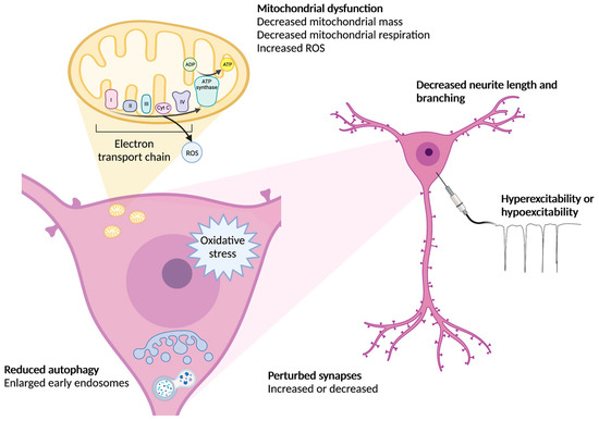 Perturbed organelle and neuron function have been reported in both familial and sporadic AD-iPSC neurons. Mitochondrial dysfunction, reduced autophagy, perturbed numbers of synapses, decreased neurite lengths and branching as well as perturbed excitability have all been reported and reflect known phenotypes shown in the AD brain. However, not all iPSC neurons show these phenotypes and variabilities between cell lines and risk genes/mutations have been noted. Created with BioRender.com.