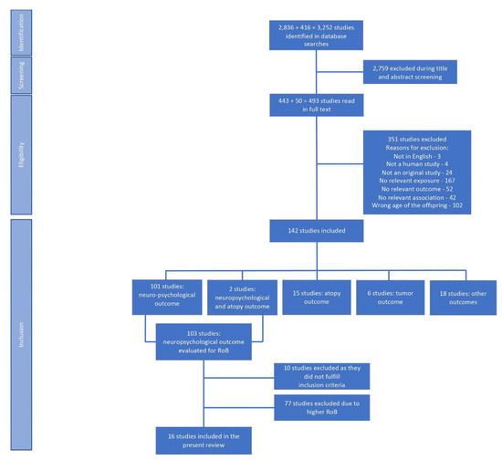 The initial search of the EMBASE and MEDLINE databases identified 2836 studies (see Supplementary Table S2). After screening their titles and abstracts, 443 studies were selected as potentially relevant by at least one of the reviewers and were read in full text. Of them, 127 fulfilled the inclusion criteria for the review. In the second search of the databases, 416 new studies were identified (Supplementary Table S3). Again, after the title and abstract screening, 50 were judged as potentially relevant by at least one reviewer and were read in full text. Of them, 15 fulfilled the inclusion criteria. Thus, 142 studies were included at this stage (Figure 1). Of them, 101 studies investigated a neuropsychological outcome; 15 investigated an atopic outcome; 6 investigated tumors including hemangiomas; 2 studies investigated both a neuropsychological outcome and atopy; and 18 examined other outcomes. Due to the large number of included studies, we decided to include only studies with a neuropsychological outcome. Therefore, the 103 studies with such an outcome were assessed for RoB (Figure 1). The studies investigating atopic diseases will be included in a future systematic review.