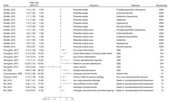 | Mir, 2021 [64] | Histopathological findings (HC, VUE, MVM, fetal thrombotic vasculopathy, villous edema, SGA or LGA placentas) | ASD | Approx. 4 years | > 1 placental lesion: ASD group 69% vs. control group 33% (p = 0.01) Presence of LGA placenta + HC: 25% vs. 2% (p = 0.01) Presence of LGA placenta: 31% vs. 4% (p < 0.01) aOR for presence of multiple lesions: 6.5 (1.6–27.1) | Sex, GA, GDM, maternal age |