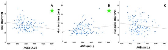 Linear regression analyses of the association of AGEs with BMI, gait speed and hand grip. (A) R = −0.22, p = 0.016; (B) R = 0.17, p = 0.049; (C) R = −0.124, p = 0.18. BMI: body mass index; AGEs: advanced glycation end products; A.U.: arbitrary unit. Significant regressions are marked with a green star.