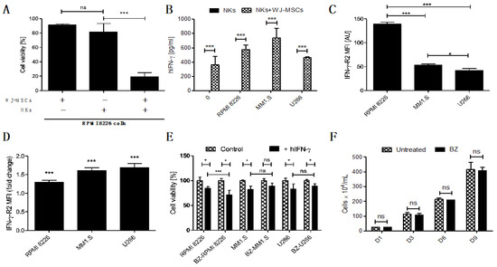 Prominence of the IFN-y in FINM and its potential in treatment of MM in combination with BZ. (A) Viability of RPMI 8226 cells after 7-day co-culture with FINM prototype containing WJ-MSCs/NKs/combination. (B) IFN-y produced by NKs in seven day co-culture with MM cell lines +/− WJ-MSCs in fibrin covered with culture medium. (C) Mean IFN-y-R2 expression per cell (MFI) in RPMI 8226, MM1.S and U266. (D) Fold change in mean IFN-y-R2 expression per cell (MFI) in RPMI 8226, MM1.S and U266 cells in culture with BZ. (E) hIFN-y effect on cell viability of the BZ-pretreted (BZ-) and not pretreated MM cells (RPMI 8226, MM1.S and U266). (F) RPMI 8226 cell line growth in culture with/without BZ (nine days). Data in (A–F) are presented as means ± SD from three technical replicates. ns—not significant; * −p < 0.01; *** −p < 0.001; one-way ANOVA, repeated measures test and Student’s t-test.