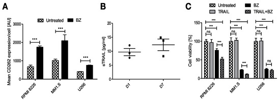 3 × 106 MM cells were seeded in T-25 flasks in complete RPMI 1640 medium (BioWest, Nuaillé, France) and treated with BZ (Velcade, Cambridge, MA, USA) with the following concentrations: RPMI—15 nM; MM1S and U266—10 nM. Cells were cultured in the presence of BZ for 72 h. Viable cells were analyzed by flow cytometry and processed for TRAIL cytotoxicity assay.