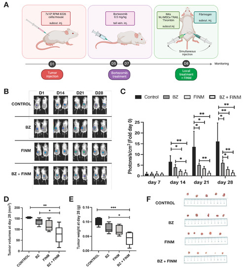 For the in vivo evaluation of the therapeutic efficacy of the FINM treatment, we used mice bearing a subcutaneous MM model with RPMI 8226 cells genetically modified for constitutive expression of luciferase. Based on our previous in vitro evidence, we tested in those mice the therapeutic effect of combining FINM (genetically engineered for the expression of TRAIL) with BZ. The treatment time points, the type of treatment, and the route of administration is depicted in Figure 5A. By bioluminescence tracking of the tumor progression in each treatment group (Control; BZ; FINM; FINM + BZ), we compared the effect of each agent and evaluated the synergy of systemically administered BZ with local cell-based immunotherapy treatment (FINM). Serial bioluminescence imaging showed that single and combined treatment attenuated the tumor progression compared to control without treatment (Figure 4B). Combined therapy with FINM and BZ had a significantly higher therapeutic effect compared to single treatment with only FINM or BZ, achieving on D28 six-fold smaller tumors compared to single treatment with BZ, and 16-fold smaller tumors compared to control group (not treated). These imaging results were confirmed by post-mortem retrieval of the individual tumors from each group on D28 (Figure 5D), following volume (Figure 5E), and weight calculations (Figure 5F).