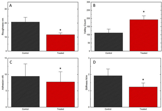 Quantitative data on ultrastructural and nanomechanical properties of the cell membrane. (A): mean square roughness between untreated and treated samples (20.78 ± 3.35 nm and 11.73 ± 1.25 nm respectively); (B): valley count (111.8 ± 22.88 and 192.73 ± 23.25, control and treated group respectively); (C): Membrane surface adhesion (9.45 ± 0.1 nN and 7.71 ± 0.08 nN (SD)); (D): Membrane stiffness (1.92 ± 0.4 N/m and 0.77 ± 0.6 N/m (SD)). * p < 0.05 in comparison with the control group.