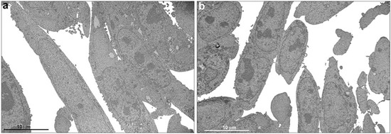 The cells exposed to [223Ra]RaCl2 (74 kBq; 2 µCi) for 24 h contained very regular and well-preserved nuclei as well as nucleoli (Figure 5a–d), very similar to the group of cells not exposed (Figure 5a–c). Moreover, the nuclear envelope was intact, displaying double-bonded membranes (Figure 5d,e). The chromatin was regular, and no heterochromatin was observed. Most DNA was in euchromatin form (Figure 5a–d).