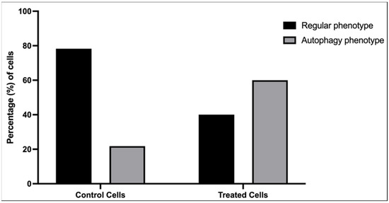 The images showed enlarged endoplasmic reticulum (Figure 5b) and mitochondria (Figure 5c). The results showed that the exposure to alpha radiation promoted the classic pathway of autophagy (Figure 5d–f) with the formation of autophagosomes and lysosomes. In Figure 5f, it is possible to observe these autophagosomes with autophagic signs of death. Quantitative analysis was performed to evaluate the expression of autophagic phenotype between the cells that were exposed and not exposed to radiation (Figure 6). Thirty random fields were observed by transmission electron microscopy and the chosen magnification for analysis was standardized to the limit of resolution, where the autophagy ultrastructural features could be observed. Figure 6 shows an increase of autophagy phenotype in MDA-MB-231 cells exposed to radiation in comparison with unexposed cells (Figure 6).