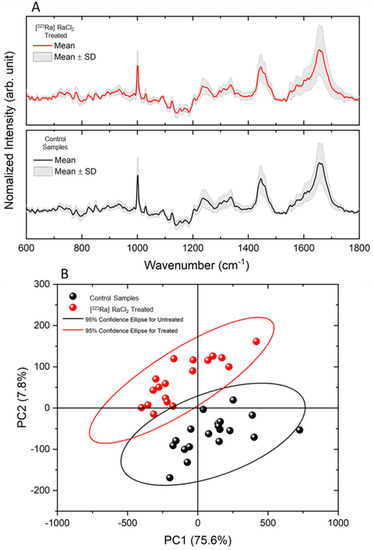 Raman spectroscopy. (A) Mean spectrum of MDA-MB-321 cells treated and untreated with [223Ra]RaCl2. (B) PCA showing the differentiation between groups with a total variance of 83.4%.