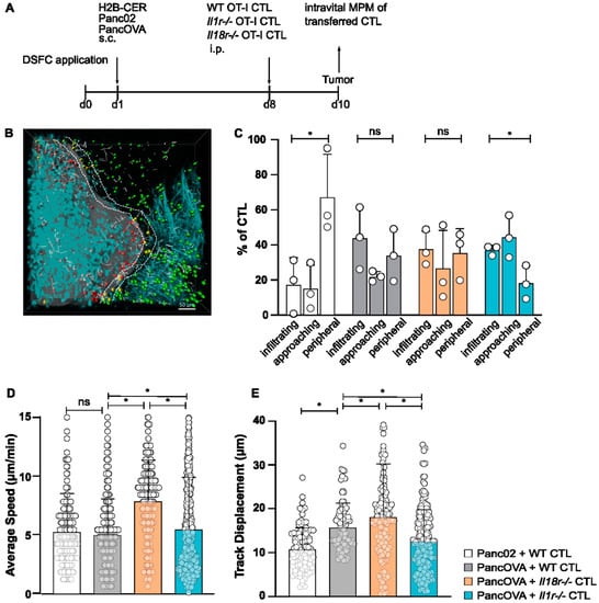 In order to visualize the infiltration of CD8+ CTLs into pancreatic cancer tissue, intravital multiphoton imaging was used. For this, IL-18R1- and IL-1R-deficient, and WT mice of the OT-1 strain, in which CD8+ T cells are specific for a peptide epitope of model antigen ovalbumin (OVA257-264), were generated in vitro by stimulating T cells with their cognate antigen in the presence of IL-2 and IL-12 (Il18r−/−, Il1r−/−, WT; Figure 1A). Murine pancreatic adenocarcinoma cell line Panc02, derived from a 3-methylcholanthrene-induced tumor in a C57Bl/6 mouse [27], was stably transfected with ovalbumin (PancOVA), as described before [25]. PancOVA cells were stably transfected with fluorochrome H2B-Cerulean. In order to visualize H2B-Cerulean-labelled cancer cells and transferred fluorophore-labelled T cells, mice were implanted with dorsal skinfold chambers (DSFCs). Through the removal of a skin flap, an imaging chamber is created in which inoculated PancOVA cells can be visualized. CTLs were adoptively transferred intraperitoneally (i.p.) into mice 7 days after the injection of PancOVA cells. The multiphoton imaging of CTLs through DSFCs was performed 36 h after transfer; the analysis of imaging data was conducted in Imaris (Supplementary Videos S1 and S2). Depending on the distance between individual T cells and PancOVA cells, CTLs were divided into infiltrating T cells (within the tumor margins), approaching T cells (<10 µm distance to tumor surface), and peripheral T cells (>10 µm distance to tumor surface) (Figure 1B). Less than 20% of the WT CTLs in representative image fields infiltrated Panc02 tumors, with more than half of the T cells remaining in the periphery (Figure 1C). This was in stark contrast to PancOVA tumors, where WT, Il1r−/−, and Il18r−/− CTLs showed significantly higher infiltration rates of around 40%. The higher infiltration of the tumor parenchyma by Il18r−/− CTLs was paralleled by a significantly higher average speed (8.05 µm/min) of Il18r−/− CTLs when compared to WT and Il1r−/− CTLs (WT: 4.83 µm/min, Il1r−/−: 4.85 µm/min) in the DSFC model (Figure 1D). Similarly, track displacement (Figure 1E) was significantly higher for Il18r−/− CTLs when compared to those for WT and Il1r−/− CTLs. Importantly, all three CTL populations that were transferred into PancOVA tumors had higher track displacement than that of CTLs found in Panc02 tumors, indicating directed, antigen-dependent motility in PancOVA tumors that express the model antigen. The receptor deficiency of approaching and peripheral T cells did not result in marked increases or decreases in average speed (Figure S1).