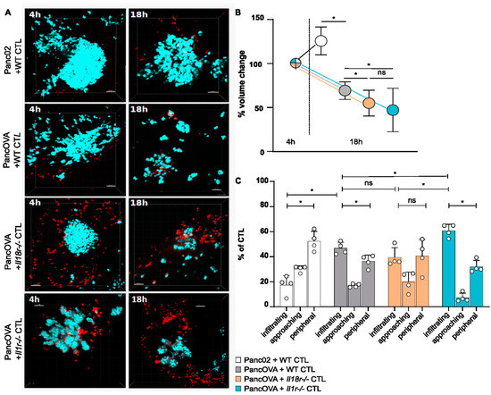 Spheroids generated with the Corning® Matrigel are three-dimensional structures that demonstrate both morphological and cellular similarities to in vivo tumors, as Matrigel mimics the extracellular matrix. In order to generate Panc02/PancOVA spheroids, Panc02 or PancOVA cells were adjusted to a cell number of 1 × 105 in 25 μL complete DMEM media (+10% FCS + 2% P/S), mixed with 25 µL Corning® Matrigel, and pipetted onto an Ibidi® 35 mm µDish. After the cell–Matrigel drop had solidified, 2 mL of complete DMEM media was added. Spheroids formed within 48 h in the incubator. After 48 h, WT, Il1r−/−, or Il18r−/− CTLs were carefully added to the spheroids at the edge of the dish. Microscopic in vivo imaging started 4 hours after coculture for the early time points, and 18 h after coculture for the late time points.