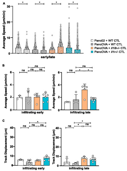 IL18R-deficient CTLs demonstrated increased motility in tumor spheroids compared to that of WT CTLs. The migratory patterns of WT, Il1r−/−, and Il18r−/− CTLs were analyzed with a spot algorithm in Imaris software via 30 min movies of a Panc02/PancOVA tumor spheroid coculture at early (4 h after the start of the T-cell coculture) and late (18 h) time points. (A) The average speed of all WT, Il1r−/−, and Il18r−/− CTLs per experiment at the early and late time points. Each dot represents one individual tracked T cell. Graph represents pooled data from n = 3–6 experiments with 431–2761 cells per subgroup. Statistical analysis was performed with the Kolmogorov–Smirnov test; * p < 0.05. (B) The average speed of infiltrating WT, Il1r−/−, and Il18r−/− CTLs at the early and late time points. The mean of every experiment (n = 3–6) is shown as a dot. An unpaired, two-tailed t-test was performed; * p < 0.05. ns = not significant (C) Track displacement indicating the directed motility of infiltrating WT, Il1r−/−, and Il18r−/− CTLs at the early and late time points. The mean of every experiment (n = 3–6) is shown as a dot. An unpaired, two-tailed t-test was performed; * p < 0.05. ns = not significant.