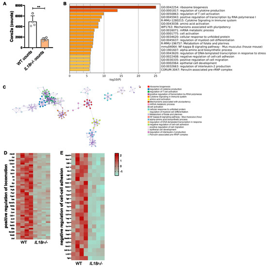 IL-18R signaling alters the transcription profile of motility-associated genes expressed in intratumoral CTLs. (A) RNA-Seq data were analyzed for the differential expression of genes that were ranked according to padj values. Coro2A expression ranked 7th among all genes with differential expression, ** p < 0.01. (B) The histogram of clustered enriched terms across input gene lists, color-coded on the basis of p-values. (C) Network of enriched terms; each color represents a distinct cluster ID. Nodes standing close to each other share the same cluster ID. (D,E) Heatmaps representing the Z-score visualization of the RNA-Seq results for (D) the positive regulation of locomotion and (E) negative regulation of cell–cell adhesion. Protein-coding genes that show significantly differential expression in WT and Il18r−/− T cells are depicted.