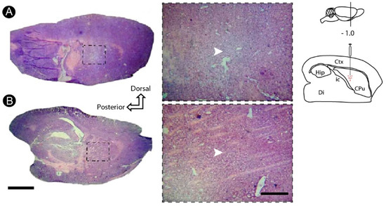 Basic histology (Nissl staining) following striatal endothelin-1 (ET-1) injection. There was a loss of tissue after seven post-lesion days (7PLD) (A), identified by a well-defined region of pallor, not observed in the control animal (B). Dashed squares in lower magnifications point to the location where higher power was obtained. Arrowheads point to the center of the injection. Drawings at the left side of the figure show the anatomical location of the ET-1 injection site into the striatum. Ctx: cortex; CPu: caudate putamen (striatum); Di: diencephalon; Hip: hippocampus; ic: internal capsule. Scale bars: 2 mm (lower magnification); 200 μm (enlargements).