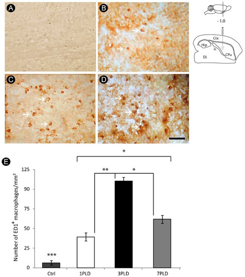 Progressive macrophage/microglia activation in the internal capsule following endothelin-1 (ET-1) striatal injection. The inflammatory response is minimal in the control group (A). At 1PLD it is possible to notice a small number of ED1+ cells (B), followed by a significant increase at 3PLD (C), with a decrease at 7PLD (D), as confirmed by quantitative analysis (E) (* p < 0.05; ** p < 0.01; *** p < 0.001, ANOVA, Tukey post hoc test). Values expressed as mean ± SEM. Arrows in B, C and D point to ED1+ cells. Drawings at the left side of the figure show the anatomical localization of the ET-1 injection in the striatum. Ctx: cortex; CPu: caudate putamen (striatum); Di: diencephalon; Hip: hippocampus; ic: internal capsule. Scale bar: 50 µm.