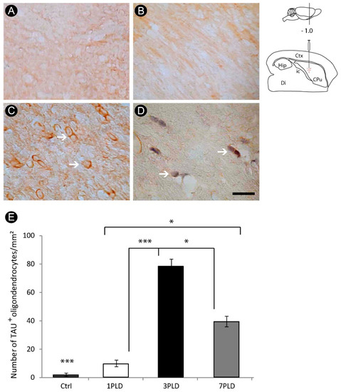 Oligodendrocyte damage in the internal capsule following endothelin-1 (ET-1) injection. Control (A) and endothelin-1-injected groups at 1PLD (B), 3PLD (C) and 7PLD (D). The peak of Tau+ cells is observed at 3PLD, as confirmed by quantitative analysis (E) (* p < 0.05; *** p < 0.001, ANOVA, Tukey post hoc test). Values expressed as mean ± SEM. Arrows in (C,D) point to TAU+ oligodendrocytes. Drawings at the left side of the figure show the anatomical localization of the ET-1 injection in the striatum. Ctx: cortex; CPu: caudate putamen (striatum); Di: diencephalon; Hip: hippocampus; ic: internal capsule. Scale bar: 50 µm.