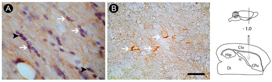 - Lima, R.R.; Oliveira, A.C.A.; Fernandes, R.M.; Nascimento, P.C.; Freire, M.A.M.; Gomes-Leal, W. Inflammatory response and secondary white matter damage to the corpus callosum after focal striatal stroke in rats. Int. J. Mol. Sci. 2022, 23, 3179. [Google Scholar] [CrossRef] [PubMed]