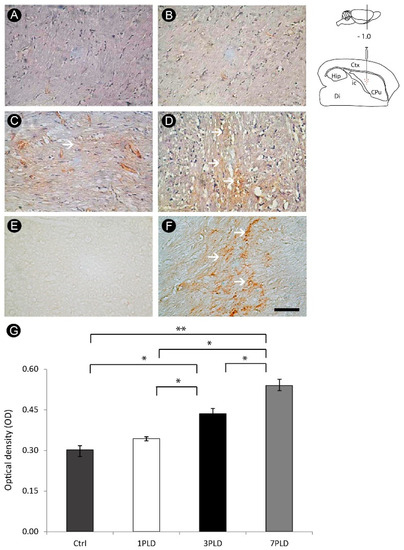 Nevertheless, the peak of macrophage/microglial activation occurred at 3PLD (111.6 ± 3.78 cells/mm2), remaining relatively high at 7PLD (60.2 ± 5.54 cells/mm2). The differences were statistically significant compared to control (6.8 ± 2.39 cells/mm2) and 1PLD groups (37.2 ± 5.54 cells/mm2) (Figure 4A–E).