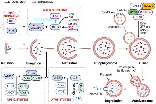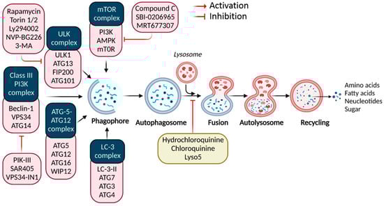 Recent evidence indicates that autophagy recycles misfolded proteins and damaged organelles, maintaining cellular homeostasis in neurodegeneration and cancer. It includes a sequence of carefully regulated/controlled processes (i.e., initiation, nucleation, elongation, lysosomal fusion, and destruction) [] (Figure 1). Research over the previous two decades has highlighted autophagy’s role in human diseases []. As a key evolutionary catabolic process for cytoplasmatic component digestion, altering the autophagic activity by targeting certain regulatory factors may affect disease processes []. Autophagy’s activation and downregulation in malignancies indicate oncogenic and tumor-suppressive characteristics []. Consequently, key autophagy targets must be identified for novel therapeutics.