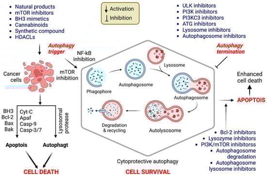 Autophagy is a well-characterized viability strategy in various tumor forms. This association might be because it protects against nutritional deficiency and substrates fundamental for cell viability; however, it may also be connected to its protective effect against programmed cell death, including apoptosis. Autophagy involvement in regulating and modulating apoptosis and apoptotic checkpoints is critical for developing cancer treatments []. The molecular interactions between apoptosis and autophagy in cancer cell treatment are presented in Figure 2.