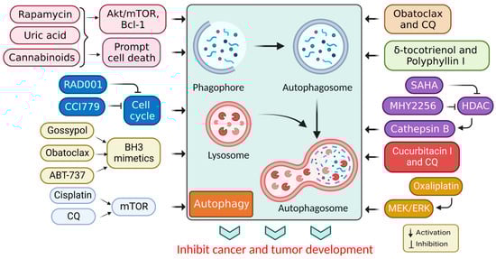 In cancer, autophagy helps promote and inhibit tumors by helping or hindering cancer cells from growing and dividing, while some drugs that fight cancer control autophagy; therefore, chemotherapy controlled by autophagy can cause cancer cells to live or die []. Autophagy regulation also affects the expression of proteins that promote or inhibit tumor growth [], and the mechanism of action associated with autophagy stimulation is presented in Table 1. Additionally, the stimulation of autophagy by various chemicals and medications in cancer treatments is presented in Figure 3.
