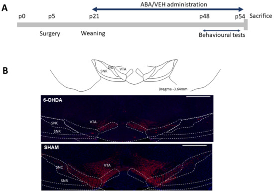 - Bouchatta, O.; Manouze, H.; Ba-M’Hamed, S.; Landry, M.; Bennis, M. Neonatal 6-OHDA Lesion Model in Mouse Induces Cognitive Dysfunctions of Attention-Deficit/Hyperactivity Disorder (ADHD) During Young Age. Front. Behav. Neurosci. 2020, 14, 27. [Google Scholar] [CrossRef] [PubMed]