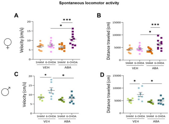 3.2. Effect of Perinatal i.c.v. 6-OHDA Injection and ABA Treatment on Spontaneous Locomotor Activity