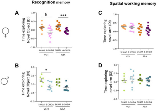 3.3. 6-OHDA Injection Reduces Novel Object Recognition, and ABA Treatment Does Not Rescue the Lesion Effect