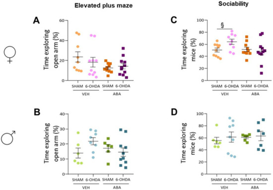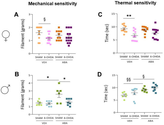 3.5. The 6-OHDA Lesion Had a Sex-Dependent Effect on Pain Sensitivity Tests—ABA Treatment Had a Potential Beneficial Effect Elevating Pain Sensitivity Threshold