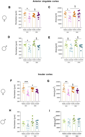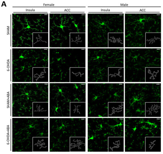 3.10. In the Posterior Insular Cortex, 6-OHDA Lesions Induced Microglia Polarization to a Proinflammatory Status Only in Females, and ABA Rescued the Effect