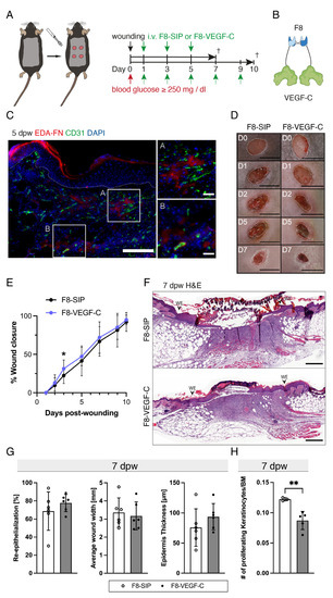 3.5. The F8–VEGF-C Fusion Protein Is Specific for Regenerating Tissue and Improves Diabetic Wound Healing