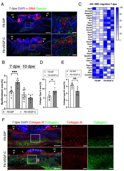 3.8. Targeted Delivery of VEGF-C Increases Myofibroblast Density and Collagen I Deposition in Diabetic Wounds