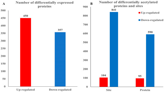 Quantity of differential proteins and acetylated proteins of Rhododendron chrysanthum under UV-B stress. (A) Number of differentially expressed proteins; (B) number of differentially acetylated proteins and sites.