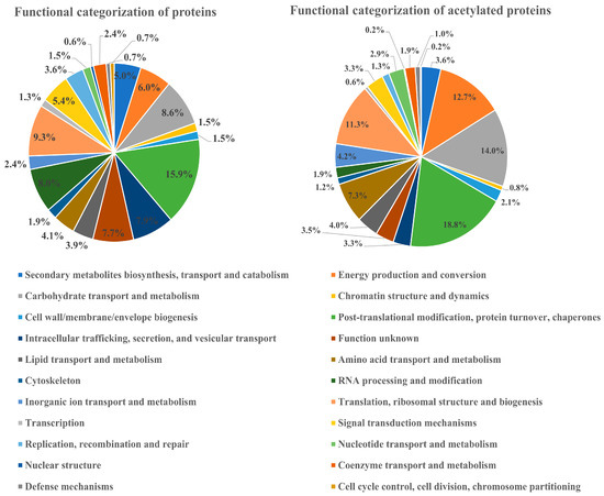 The classification of differentially acetylated proteins and differentially expressed proteins was carried out by COG (Cluster of Orthologous Groups of proteins) (Figure 3). The differentially acetylated proteins and the differentially expressed proteins fell into 22 functional categories. Differential acetylated proteins are shown on the right side of Figure 2; Rhododendron chrysanthum has 98 differentially acetylated proteins enriched into post-translational modification, protein revenue, and chaperone, accounting for 18.8% of 73 differentially acetylated proteins that are enriched in the transport and metabolism of carbohydrates, representing 14.0% of 66 differentially acetylated proteins enriched in the production and conversion of energy, representing 12.7%. The differentially expressed proteins are expressed on the left-hand side of Figure 2. Here, 85 differentially expressed proteins are enriched in post-translational modification, protein turnover, and chaperones, accounting for 15.9%; 50 differentially expressed proteins are enriched in translation, ribosomal structure, and biogenesis, accounting for 9.3%; and 46 differentially expressed proteins are enriched in carbohydrate transport and metabolism, which accounts for 8.6% of the total proteins.