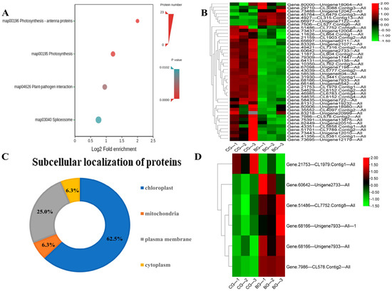 For the results of KEGG annotation, 807 DEPs in the sample were mapped to 33 KEGG pathways, and it was found that DEPs were significantly rich in photosynthesis, photosynthesis-antenna protein, and plant pathogen interaction (Figure 5A).