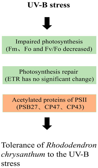 Throughout this study, we employed Rhododendron chrysanthum as materials to investigate its photosynthetic capacity under UV-B radiation. In addition, the effects of UV-B stress on photosystem II proteins of Rhododendron chrysanthum were studied by acetylation proteomics and proteomics.