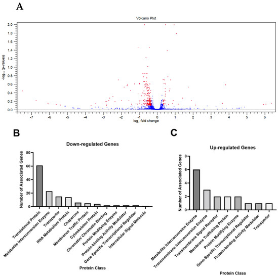 RNAseq analysis. (A) A volcano plot showing altered genes in RNA-Seq analysis with red dots indicating genes that have a fold change larger than 1.25 and less than −1.25 with p−value < 0.05. (B–E) Bar graphs represent classes of genes that were differentially expressed due to the treatment of QDs. Each bar is the number of differentially expressed genes in a protein class or associated with a biological process. (B) Downregulated genes sorted by protein class. (C) Upregulated genes sorted by protein class. (D) Downregulated genes are sorted by associated biological processes. (E) Upregulated genes sorted by associated biological processes.
